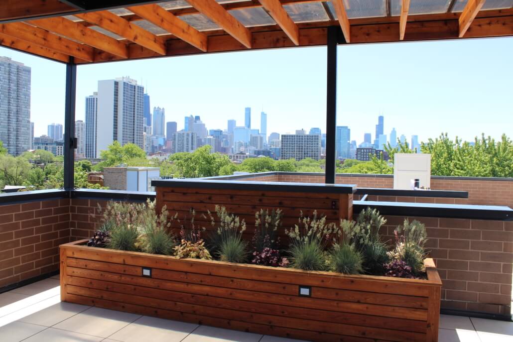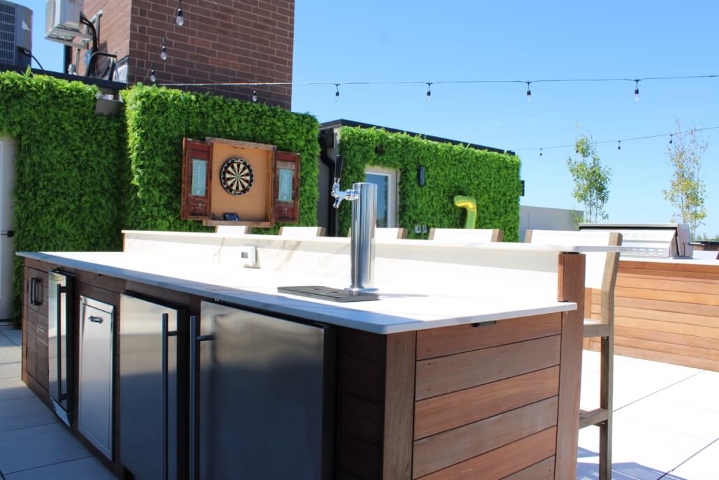 These clients wanted an all-out party on their rooftop! They outfitted it with two turf lounge areas, a faux greenery wall, custom dart board, and all the rooftop hits. An outdoor kitchen and bar feature a grill, storage, kegerator and fridge. One final surprise is stowed away in the custom planters: a pop up TV!